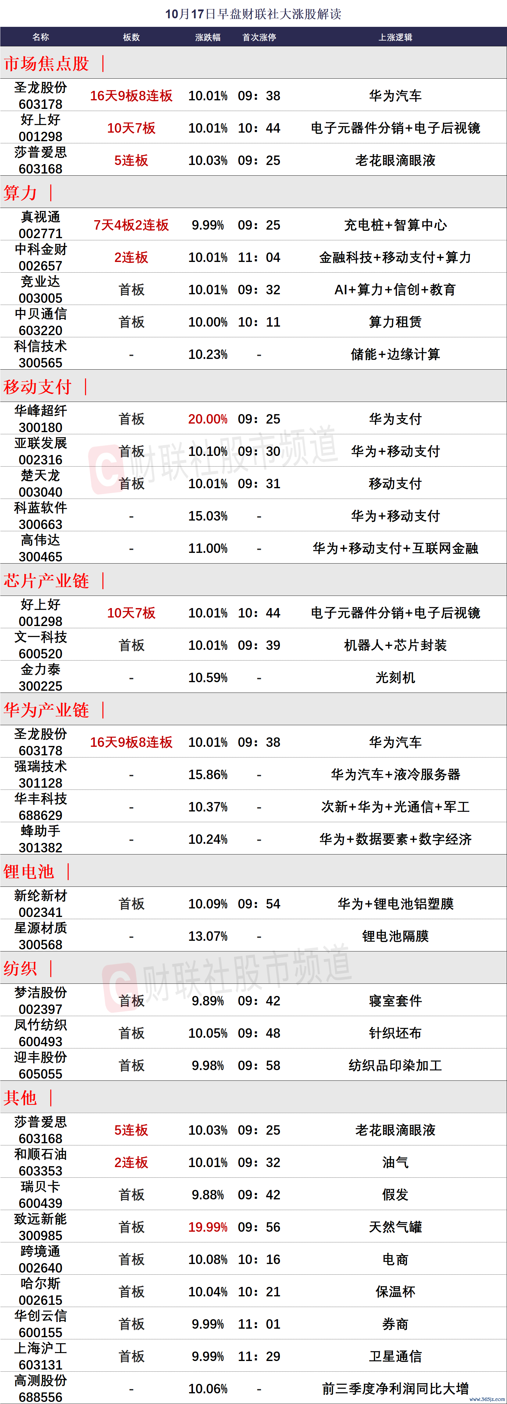 板块上,移动、跨境支付板块涨幅居前,其中华峰超纤20CM涨停,、科蓝软件涨超10%,先进数通、南天信息、拉卡拉、天源迪科等个股涨幅居前。消息面上,第三届“一带一路”国际合作高峰论坛开幕式将于10月18日在北京举行。此外近日央行网站显示,同意华为旗下支付公司深圳市讯联智付网络有限公司变更公司名称为“花瓣支付(深圳)有限公司”。华峰超纤在互动平台上表示,子公司威富通作为华为的合作伙伴,将以支付为基础进行场景建设,通过批量获客+持续运营,助力银行业务发展。